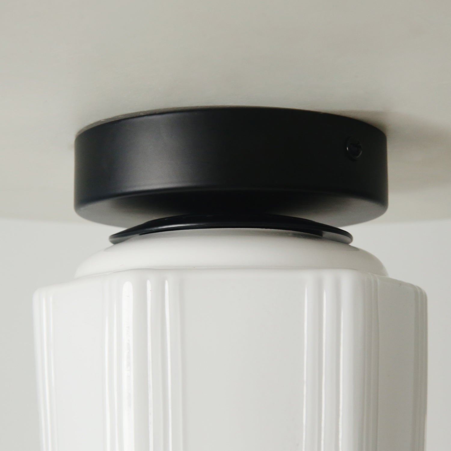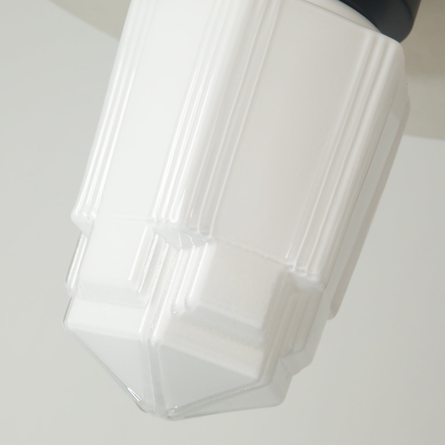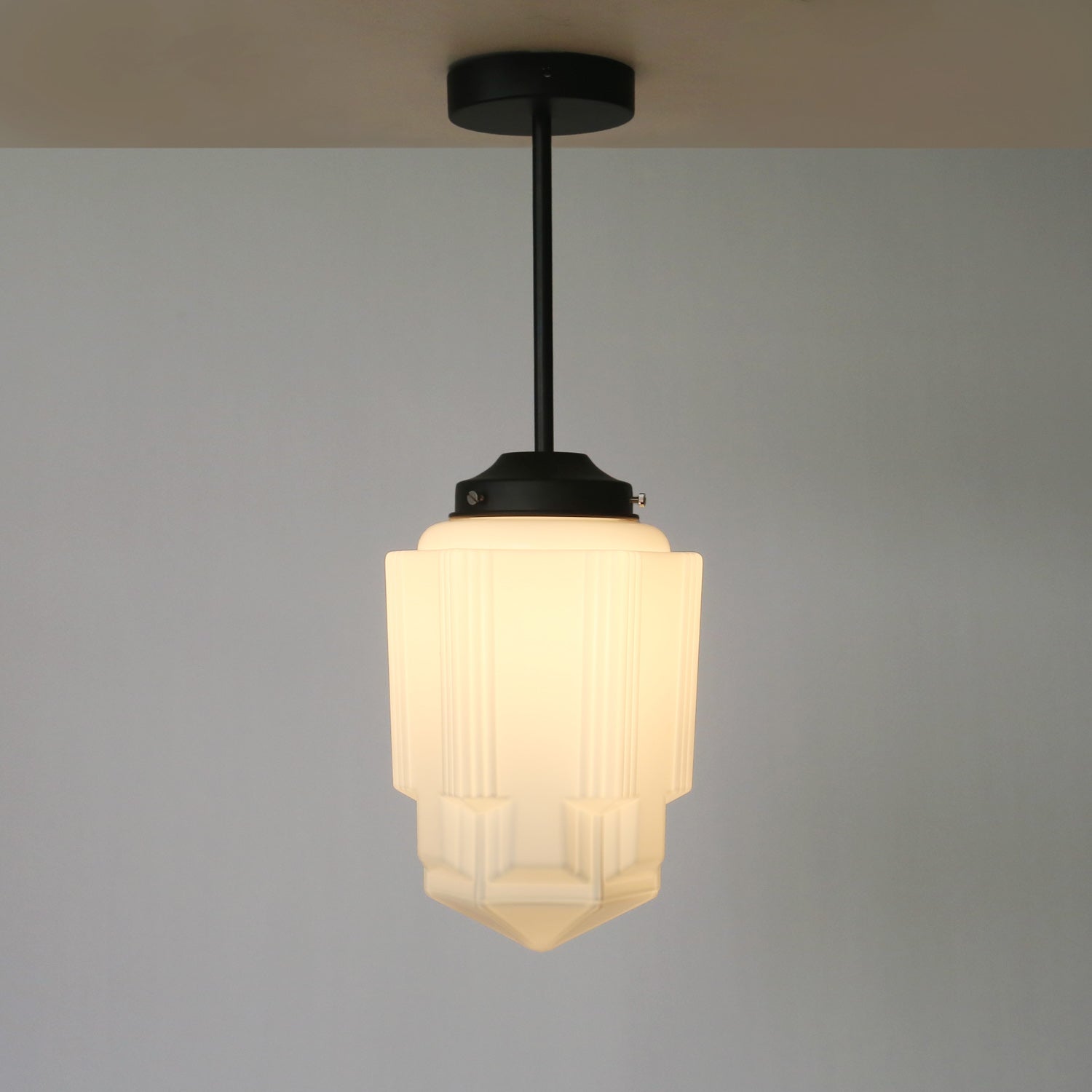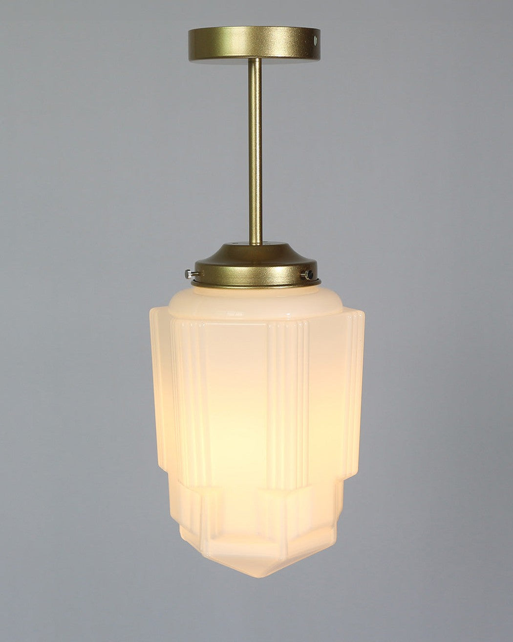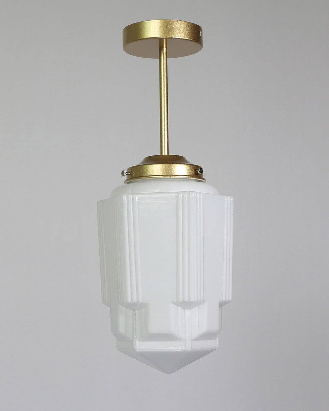 Milky white frosted glass shade. Option of brass or black metal fittings. |