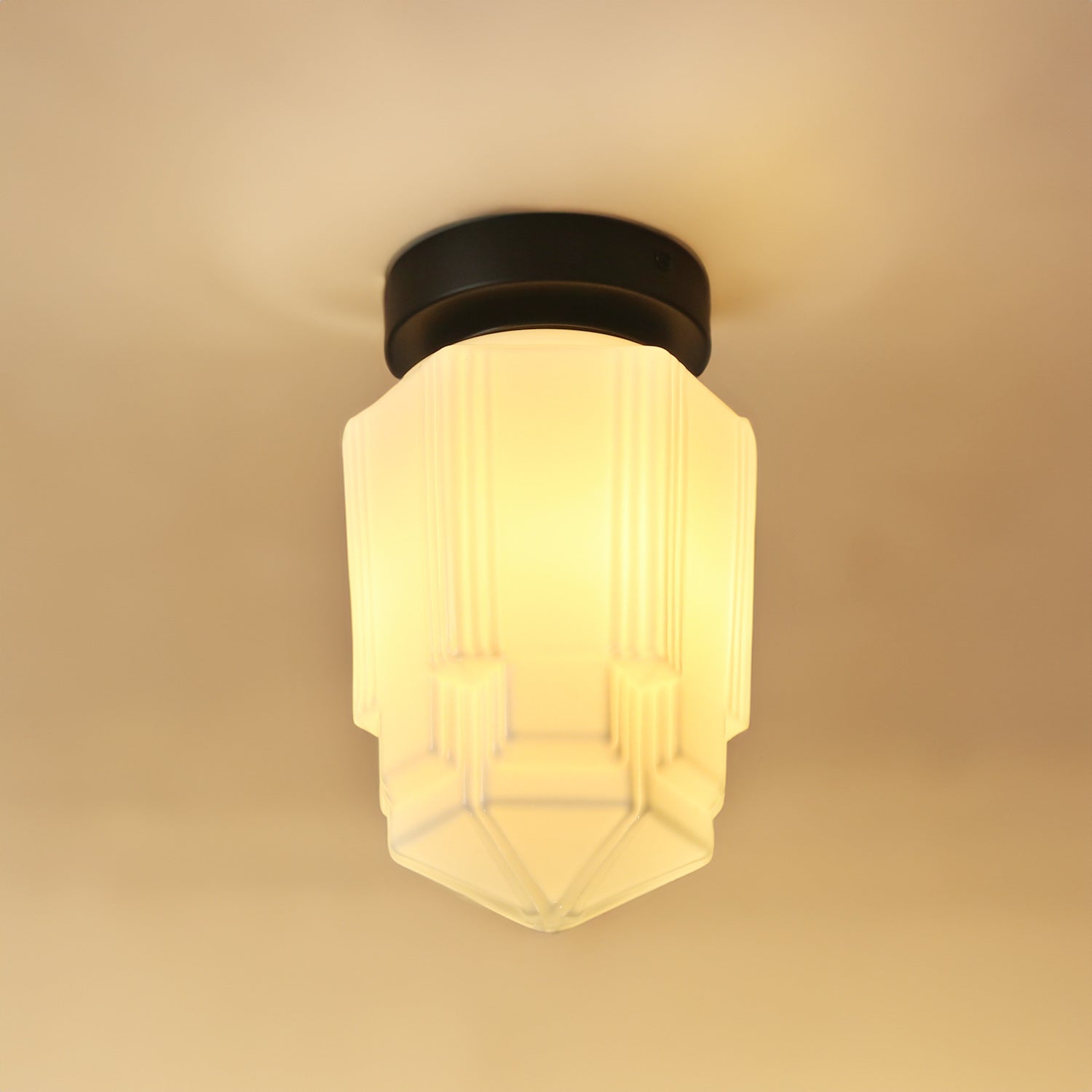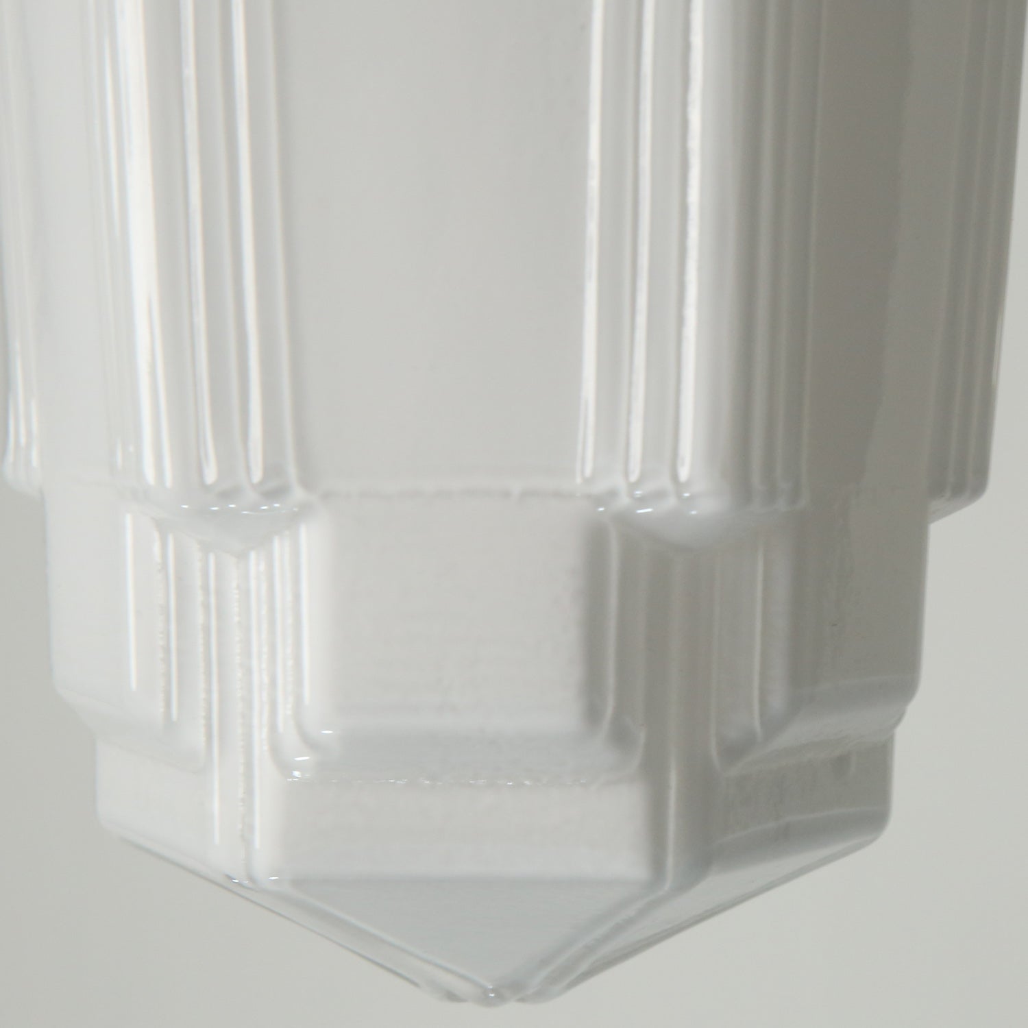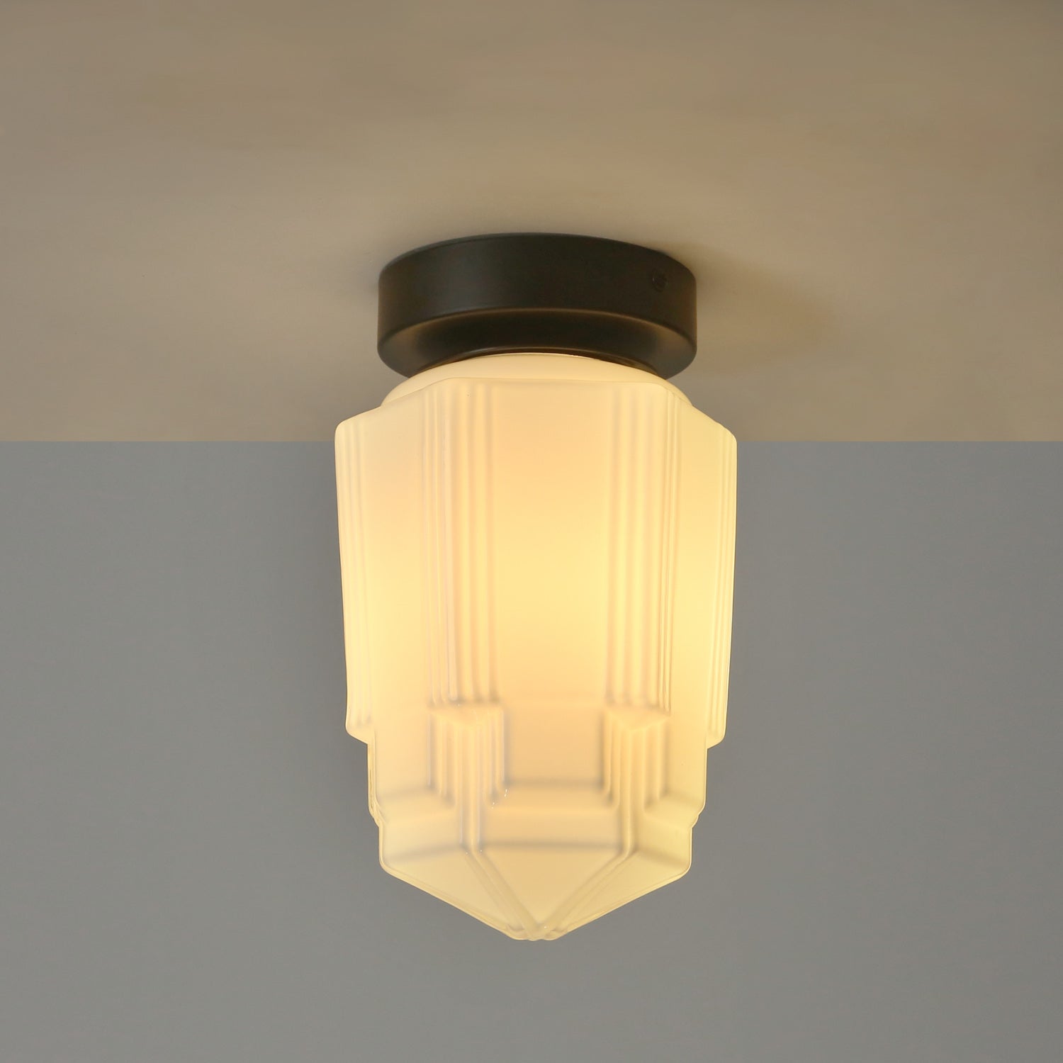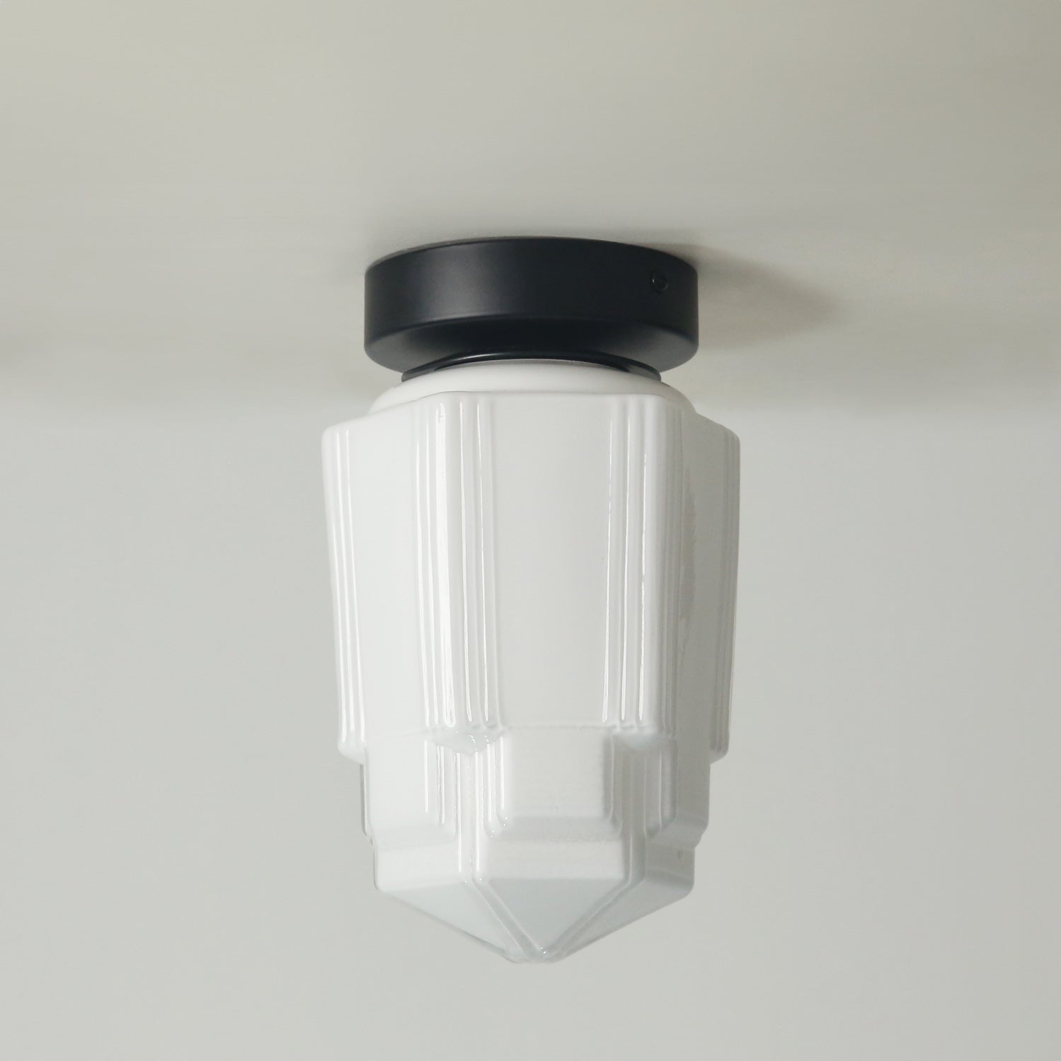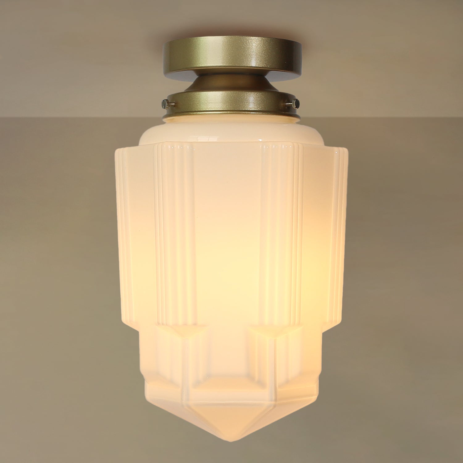 Milky white frosted glass shade. Option of brass or black metal fittings. |