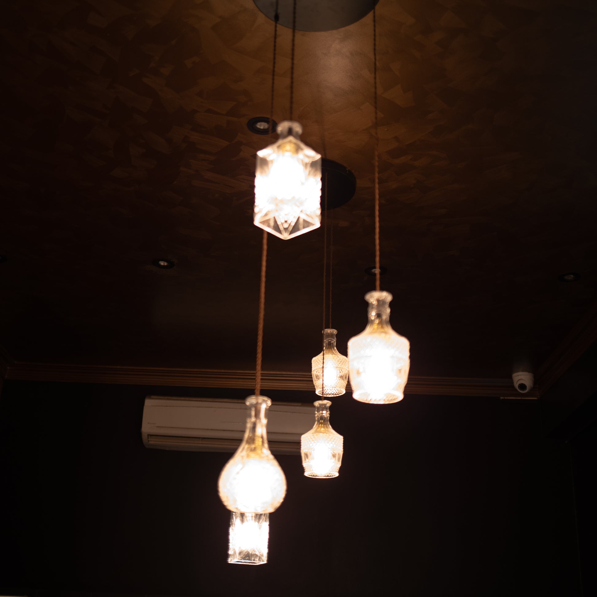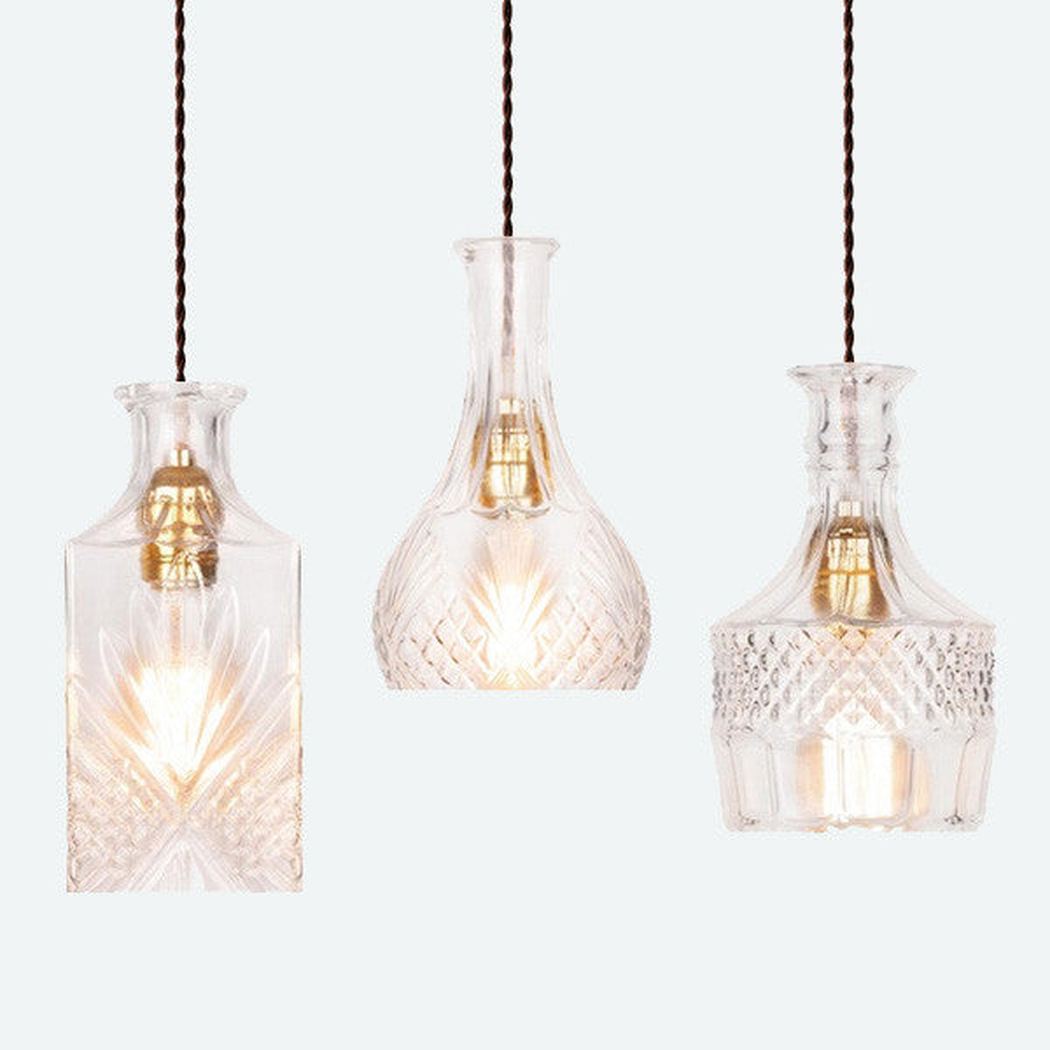 The bottle light Chandelier is a stunning lighting centrepiece featuring one Square, one Bell and one Tulip Decanter lights hung at various lengths to create a luxurious installation of clear, hand cut, crystal shades. Can be arranged as cluster pendant light chandelier