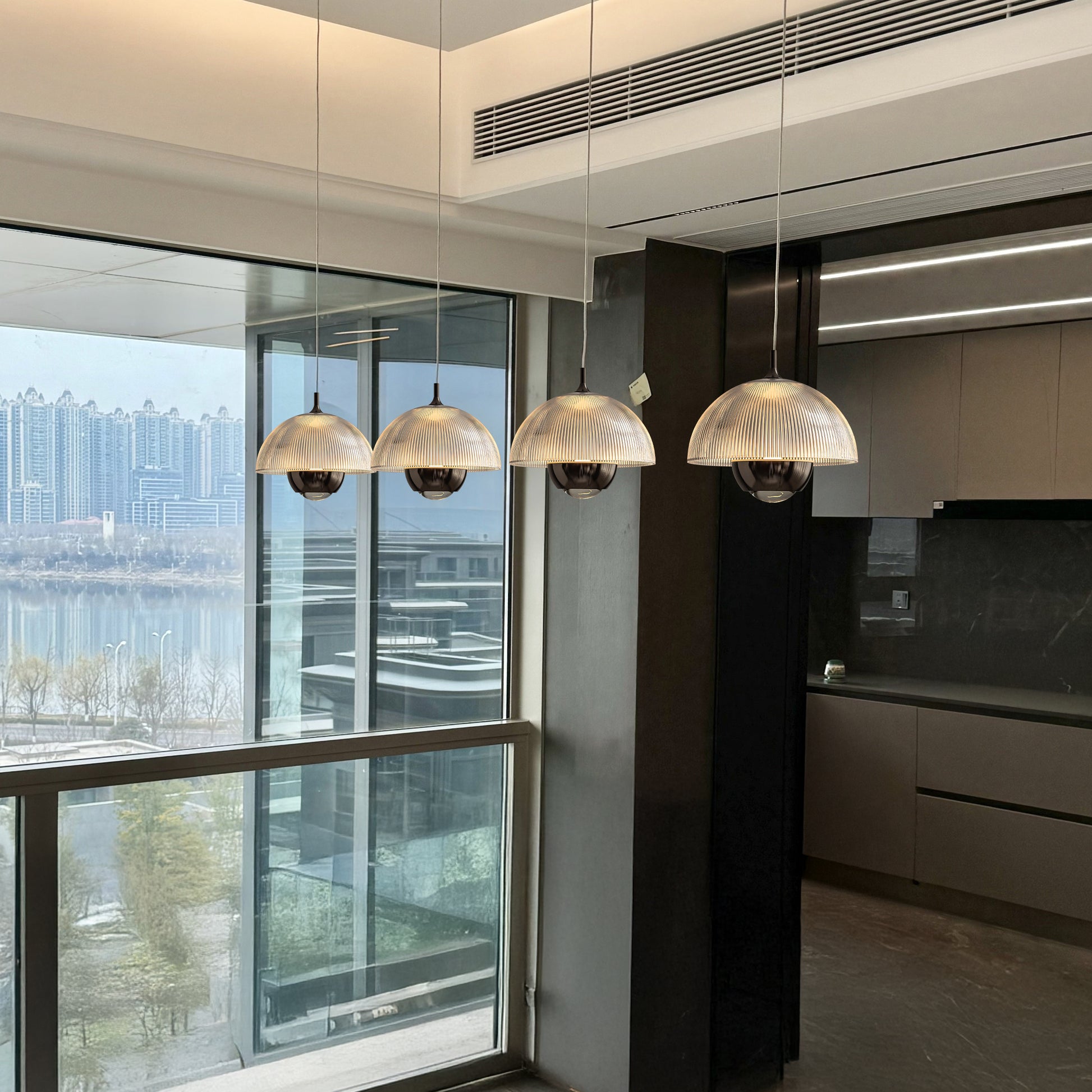 The Eclipse Pendant Light features a ribbed glass dome that diffuses a warm LED glow, blending modern elegance with soft ambient lighting. Its sculptural form makes it ideal for kitchen islands, bedside lighting, living rooms, or above tables in restaurants and cafés.
