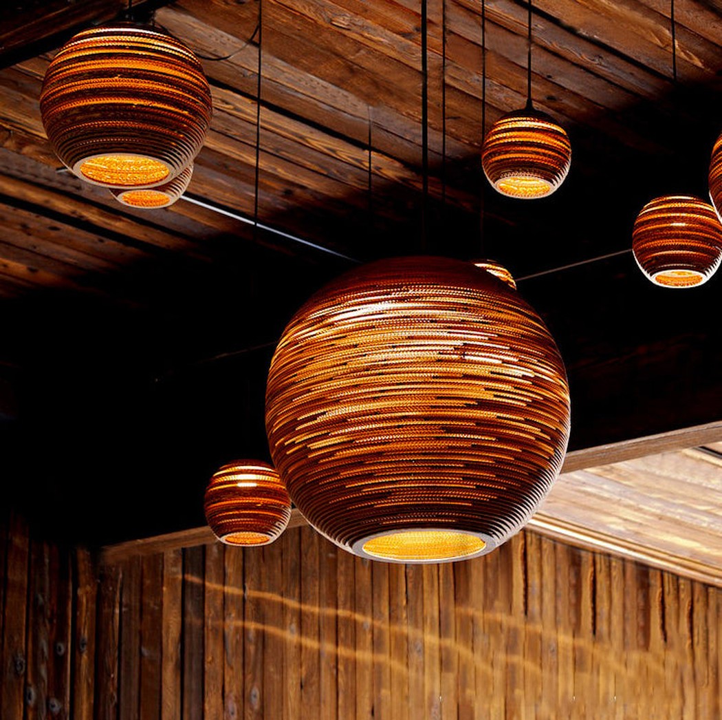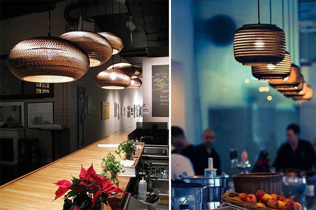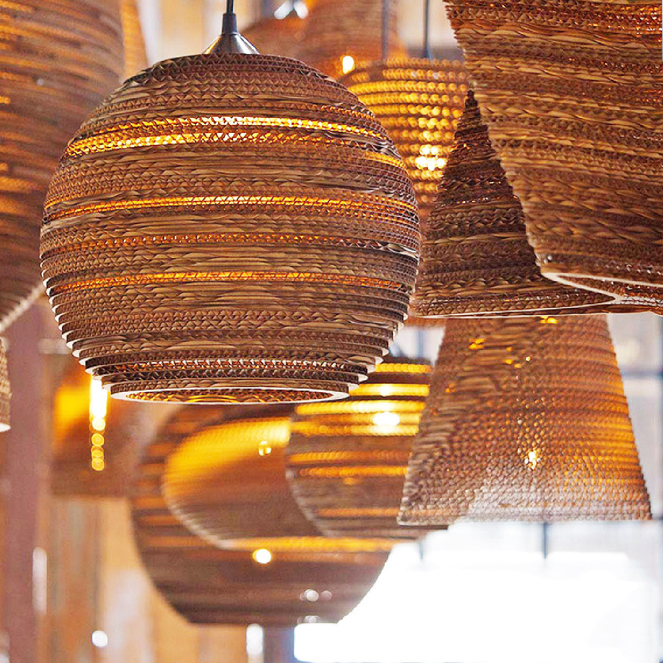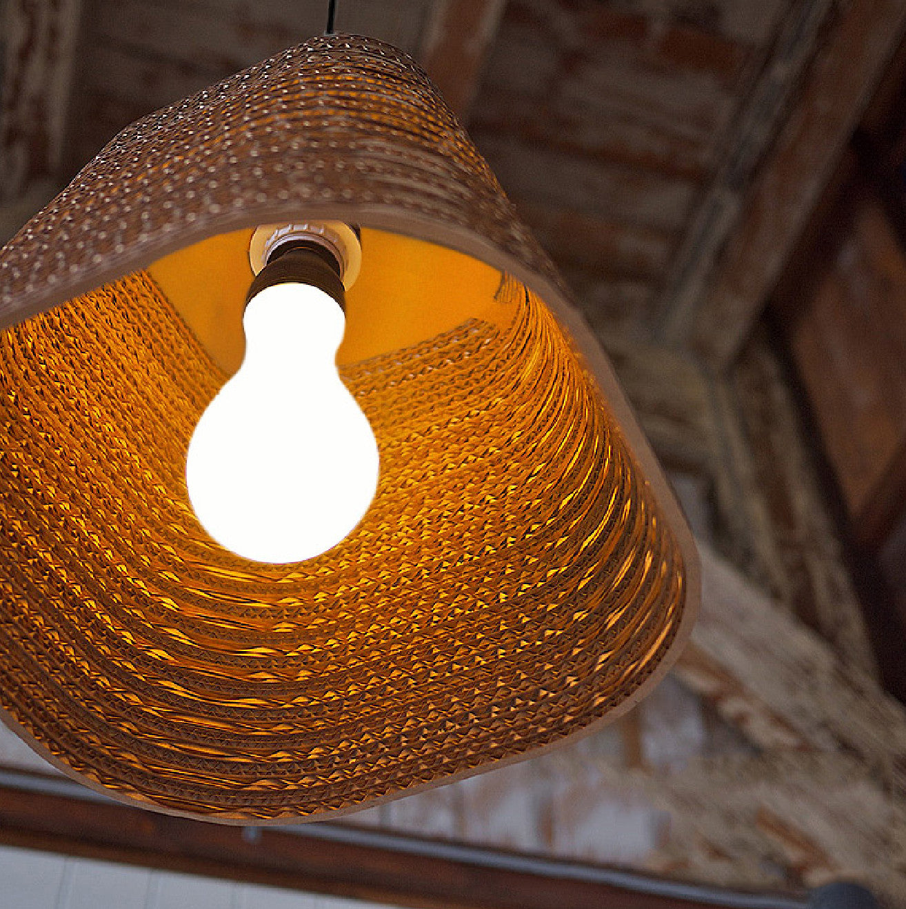 Using material outside the box, or should we say the material is the box itself. Unique and creative modern pendant light design. An entire range of corrugated cardboard made ceiling lights to give warm illumination to your room. When the light is on, the cardboard domes act as a beautiful diffuser, giving out interesting texturised shadow. Comes in 6 different shapes and sizes designed to be used as a chandelier cluster.