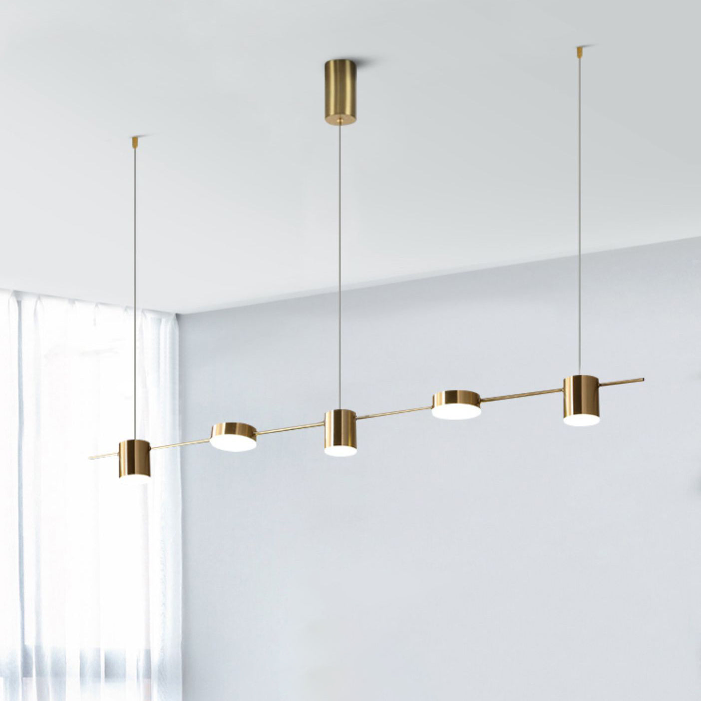 This Nori Minimalist Brass Pendant Light offers a distinctively elegant design, featuring contemporary style and high quality materials. Its aesthetically pleasing silhouette is complemented by the energy-efficient 5 LED light sources, providing beautiful illumination to any kitchen island, dining room, or other space.